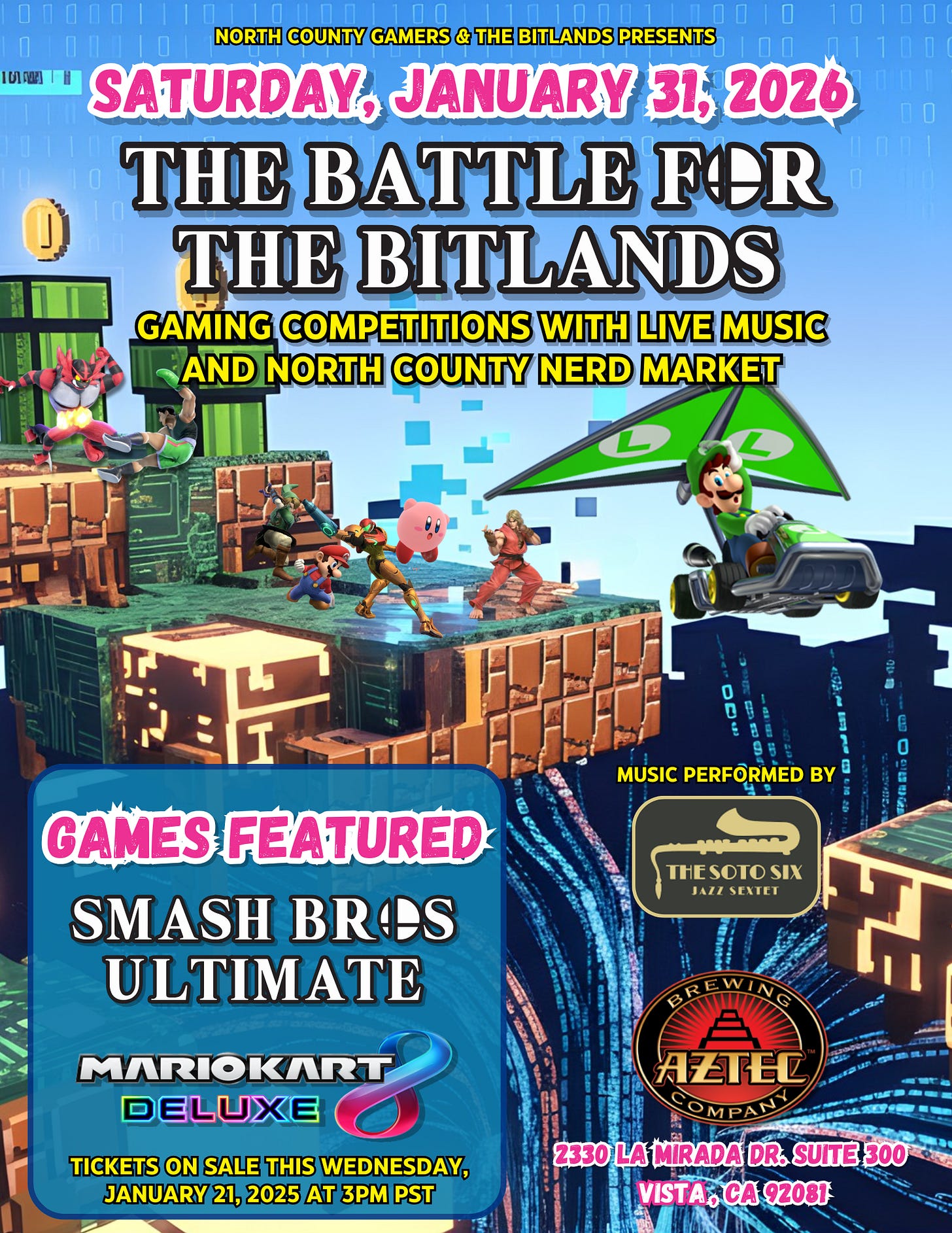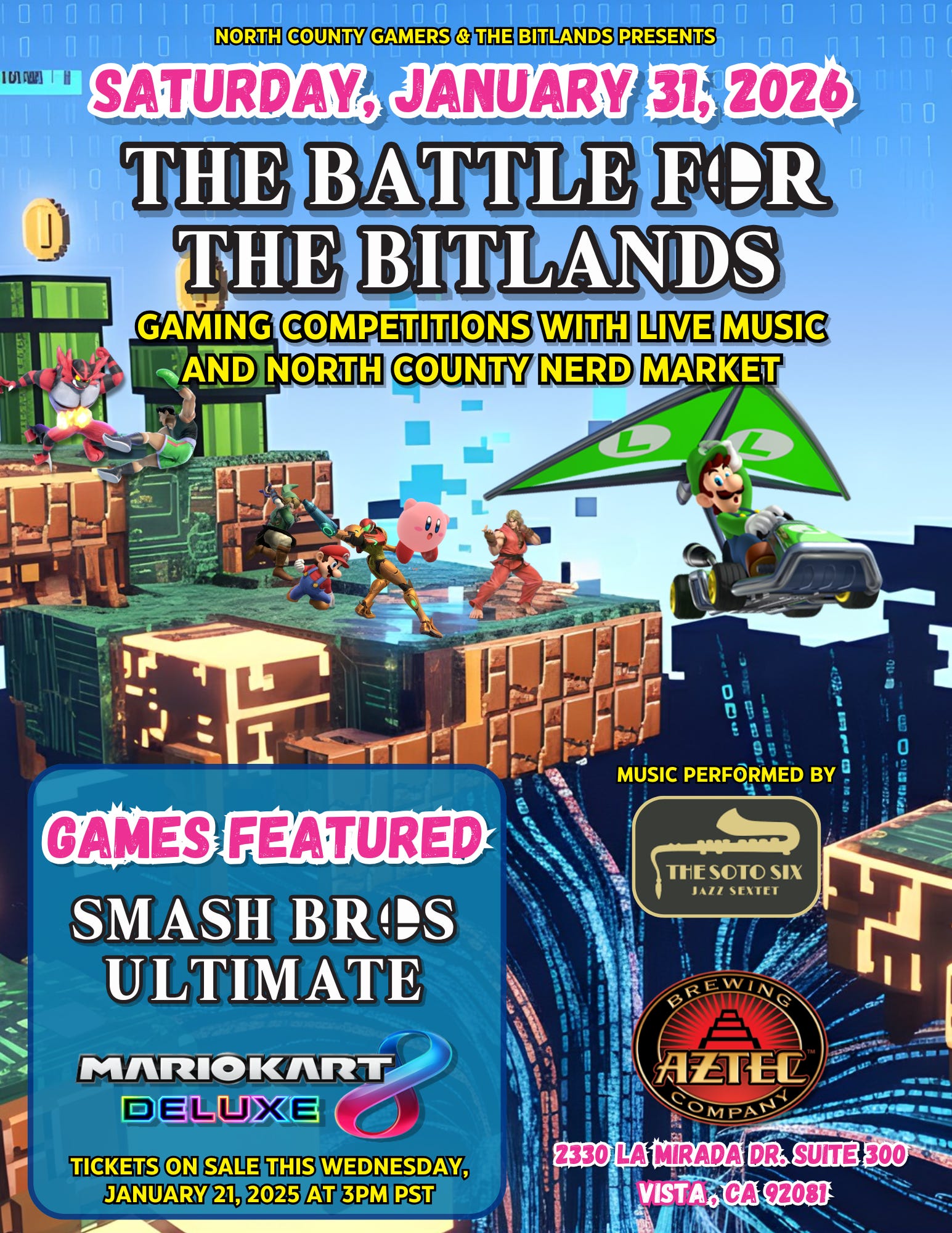 Imagine drifting through Rainbow Road or landing a Final Smash while a professional jazz band performs the soundtrack in real-time. The Soto Six will be on stage starting at 7PM, syncopating their set to the action on the screen.